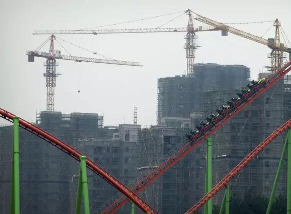 " 最新、最刺激 " 的游乐设备成为各地主题公园的主打卖点。主题公园的成功也带动了周边的酒店和地产,成为政府和地产商共同垂涎的奶油项目。图为 2016 年5月28日,江西南昌,中国最大的民营房地产开发商投资建成的万达主题公园开园。园内过山车的背景是在建的楼盘。